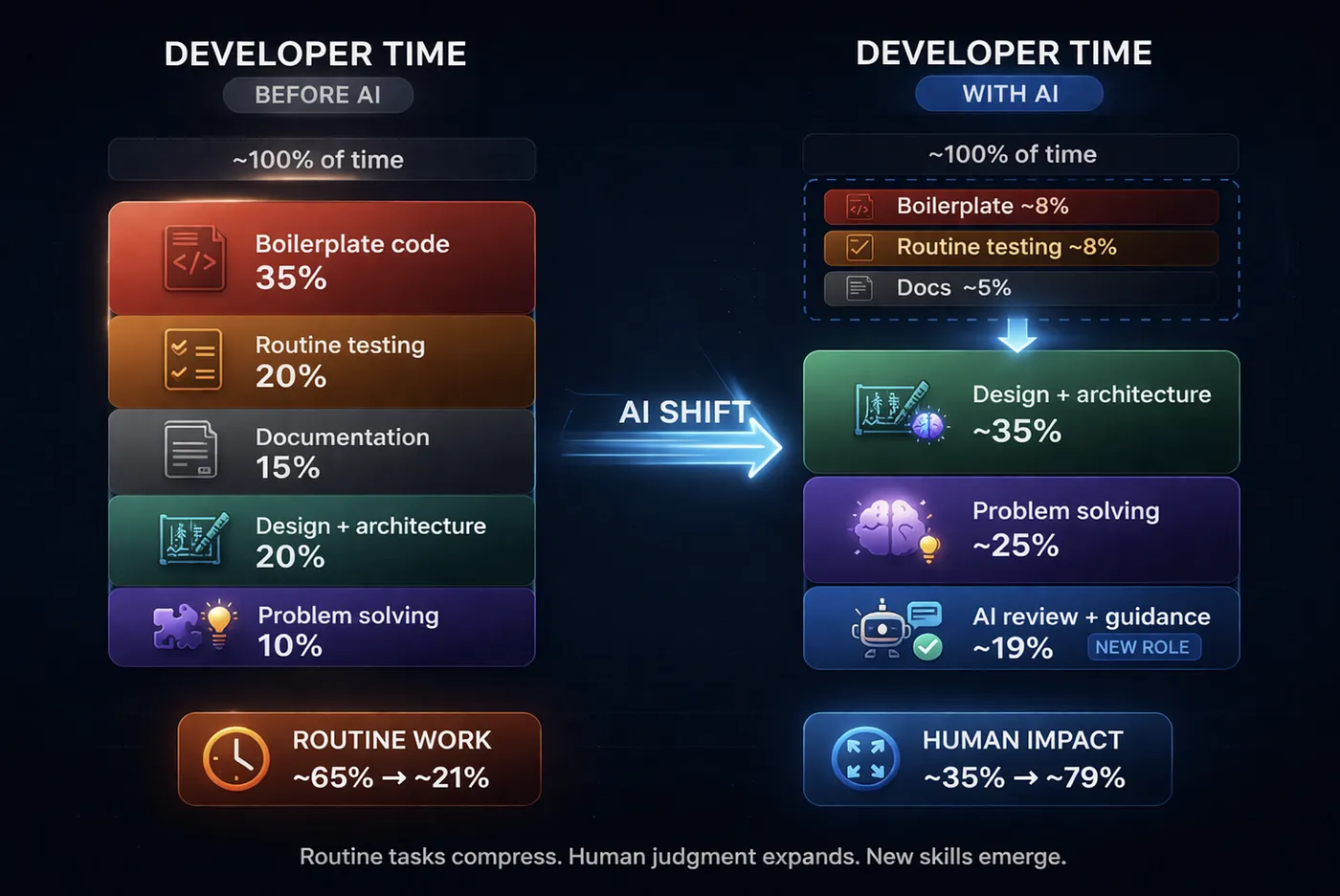 Consider a developer who previously spent significant time writing boilerplate code. With AI assistance, that portion of the work is reduced. The developer’s role shifts toward system design, architecture, and problem-solving the parts that actually require human judgment.