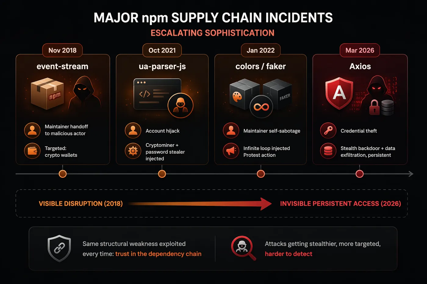 The Axios incident was not an isolated event. It sits within a broader trend that has been accelerating since the event-stream compromise in 2018, through the ua-parser-js attack in 2021, the colors and faker self-sabotage in 2022, and now this.