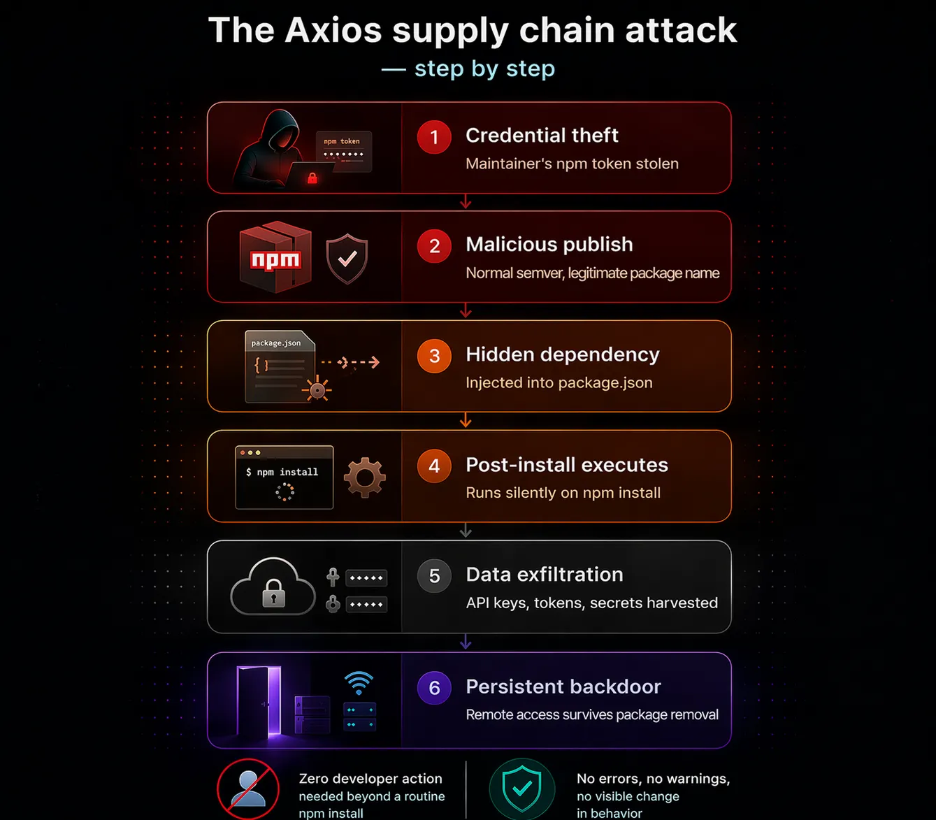 - In late March 2026, attackers compromised the npm publishing credentials of an Axios maintainer and released malicious versions of one of JavaScript’s most-used HTTP libraries.