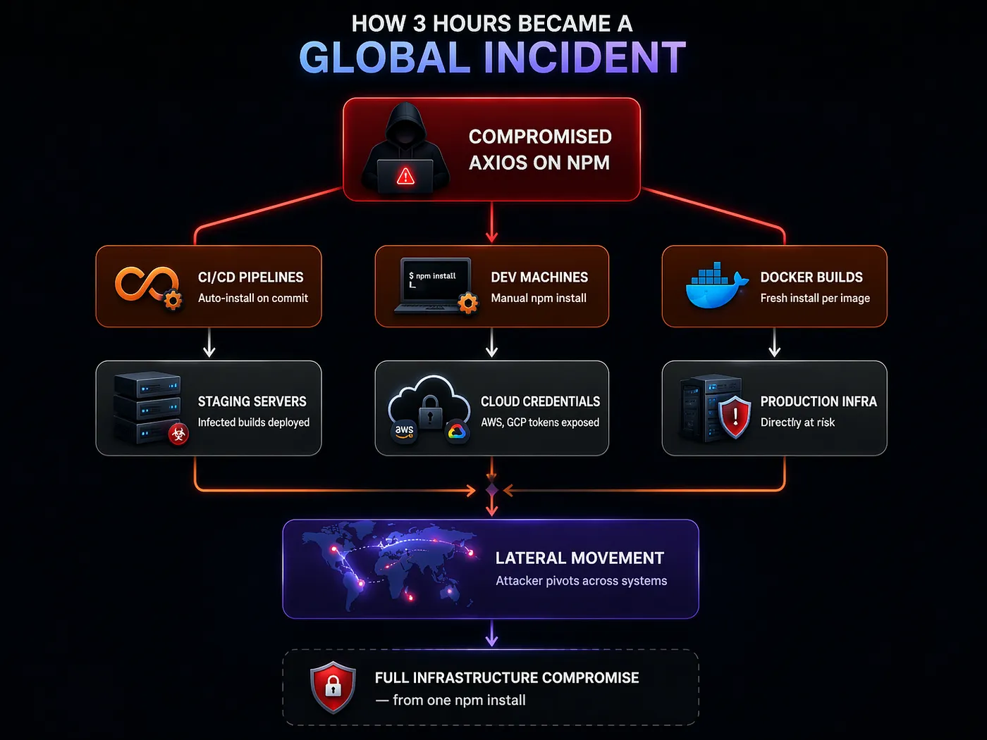 Consider a typical mid-size development operation running 15–20 CI builds per hour across multiple projects. In 3 hours, that is 45–60 fresh npm install executions each one potentially pulling the compromised Axios version. Multiply that across every company, every open-source project, and every solo developer worldwide who happened to be working during those hours, and the scale becomes clear.